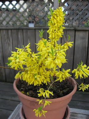 and FINALLY our little Forsythia plant actually bloomed. We have picked up our free Forsythia clipping at the Brooklyn Botanic Garden Forsythia Member Day for three years, and we finally got a non dud clipping!